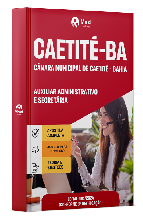 Apostila completa e atualizada para o concurso do(a) Câmara de Caetité-BA 2025, cargo Auxiliar Administrativo e Secretária.