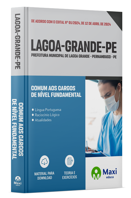 Apostila completa e atualizada para o concurso da Prefeitura de Lagoa Grande - PE 2024, cargo Nível Fundamental: Agente Comunitário de Saúde; Auxiliar de Serviços Gerais; Carpinteiro; Cozinheiro; Eletricista; Encanador; Motorista; Operador de Motoniveladora; Operador de Pá Carregadeira; Operador de Retroescavadeira; Pedreiro; Pintor; e Serralheiro..