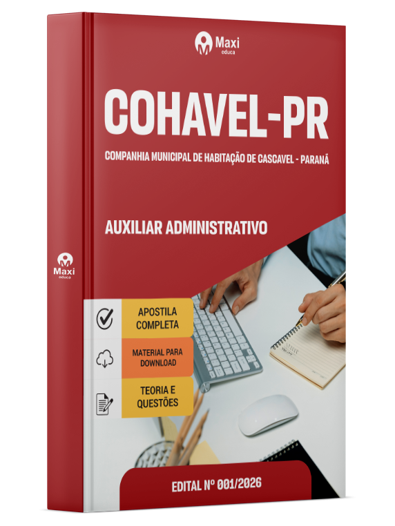Liberação prevista para: 15/04/2026Apostila COHAVEL-PR 2026 - Auxiliar Administrativo