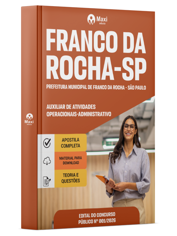 Liberação prevista para: 13/04/2026Apostila Prefeitura de Franco da Rocha - SP 2026 - Auxiliar de Atividades Operacionais - Administrativo