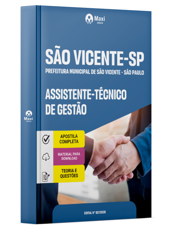A Apostila Digital Prefeitura Municipal de São Vicente - SP em PDF 2026 - Assistente-Técnico de Gestão foi organizada para proporcionar um melhor rendimento na sua preparação, abordando cada conteúdo de forma objetiva e direcionada. Estude para o Concurso da Prefeitura Municipal de São Vicente - SP 2026 com um material de acordo com o Edital oficial para o cargo de Assistente-Técnico de Gestão.