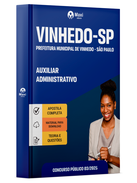 Liberação prevista para: 10/12/2025Apostila Prefeitura de Vinhedo - SP 2025 - Auxiliar Administrativo