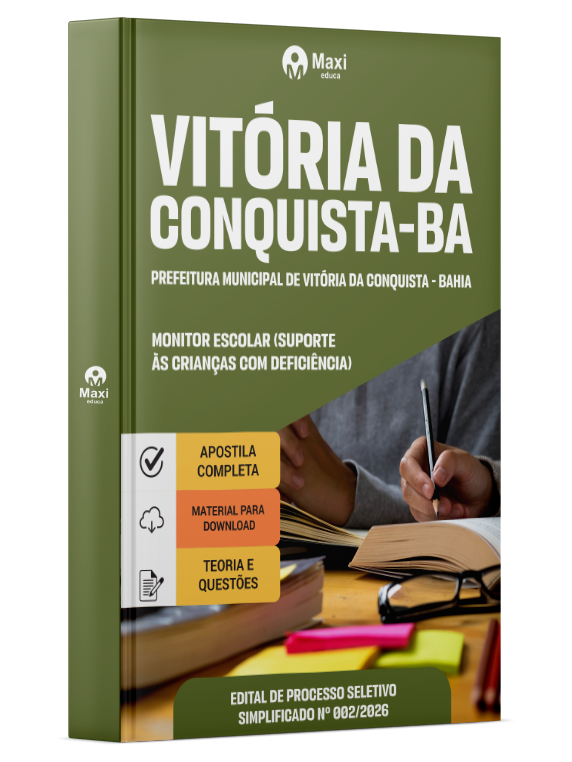 Liberação prevista para: 07/05/2026Apostila Prefeitura de Vitória da Conquista - BA 2026 - Monitor Escolar (Suporte às Crianças com Deficiência)