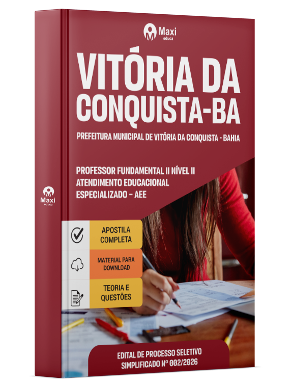 A Apostila Digital Prefeitura Municipal de Vitória da Conquista - BA em PDF 2026 - Professor Fundamental II Nível II - Atendimento Educacional Especializado – AEE foi organizada para proporcionar um melhor rendimento na sua preparação, abordando cada conteúdo de forma objetiva e direcionada. Estude para o Concurso da Prefeitura Municipal de Vitória da Conquista - BA 2026 com um material de acordo com o Edital oficial para o cargo de Professor Fundamental II Nível II - Atendimento Educacional Especializado – AEE.