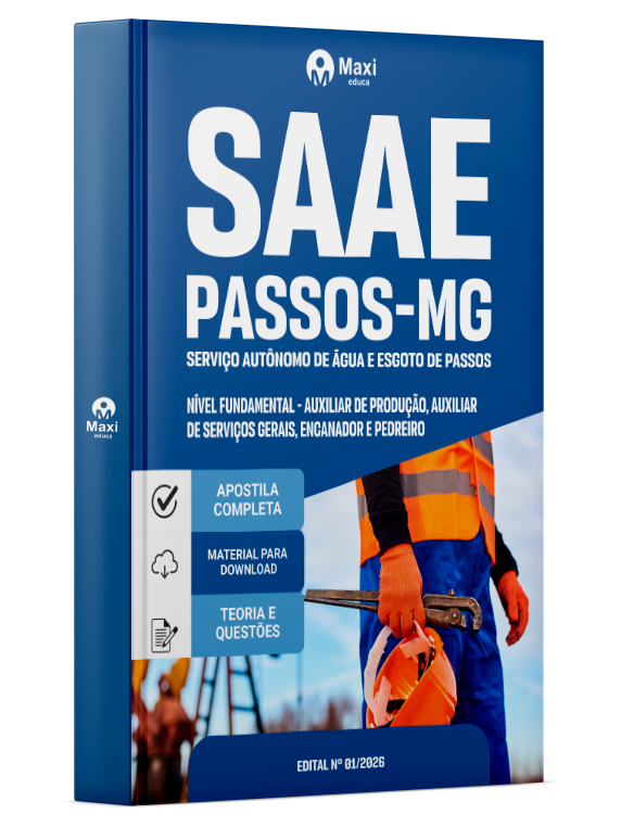 Liberação prevista para: 25/03/2026Apostila SAAE Passos-MG 2026 - Nível Fundamental - Auxiliar de Produção, Auxiliar de Serviços Gerais, Encanador e Pedreiro