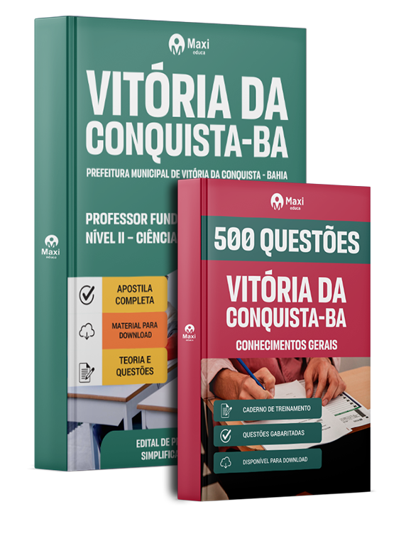 - Apostila Prefeitura de Vitória da Conquista - BA 2026 - Professor Fundamental II Nível II - Ciências: reúne todo o conteúdo teórico exigido no último edital, com explicações claras e exercícios práticos elaborados por especialistas em concursos.